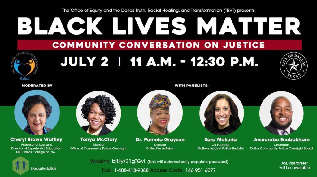 Race continues to dictate outcomes for communities of color. Racial justice is critical to combat the systemic disparities that disproportionately impact the African American community. The rectification of justice must go beyond the absence of discrimination. Challenging institutional and structural racism is essential if we are to reach an equitable society that serves everyone. Join the City of Dallas on July 2, 2020 for our Community Conversation on Justice, where panelists will discuss the importance of justice in our African American communities. This is the part two of Black Lives Matter: A 3-Part Series of Community Conversations on Racial Equity, Justice, & Resilience. Register here |